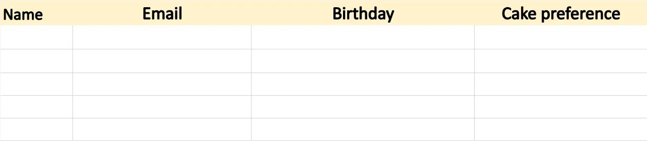 To get started making your Excel form, open a blank spreadsheet. For our tutorial we're going to gather preferences for employee birthday parties. Here's an example of the columns you'll add to your Excel worksheet: