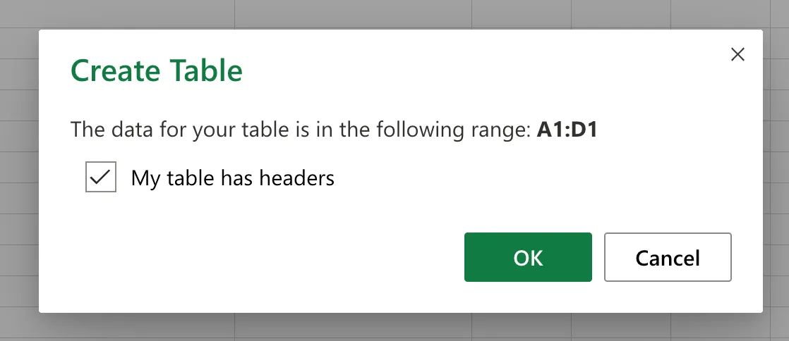 (Source: Microsoft Excel Online) Once you've set up your columns it's time to convert them into a table. Select the column headings, then Insert > Tables > Table. When the dialogue box pops up, check the My table has headers box.