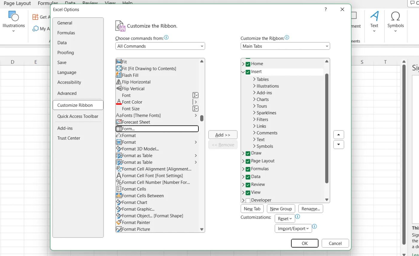 (Source: Microsoft Excel)Now we have to add a 'form' to the Excel sheet. Only, by default, the option isn't in the top menu. So first we have to add it in. To do this: