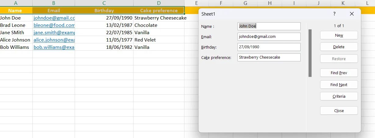 (Source: Microsoft Excel) Your work is nearly over. All you need to do is select the header row of your sheet, click on the Form button, and fill in the fields. Click New to add a response to the spreadsheet.