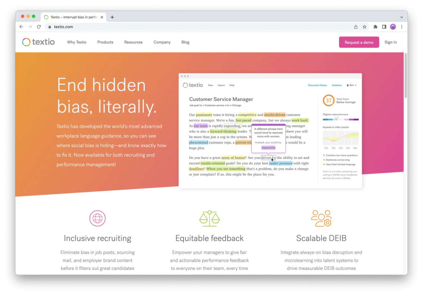 Price: Unfortunately, Textio doesn’t make its pricing publicly available. You’ll need to request a demo to find out more.